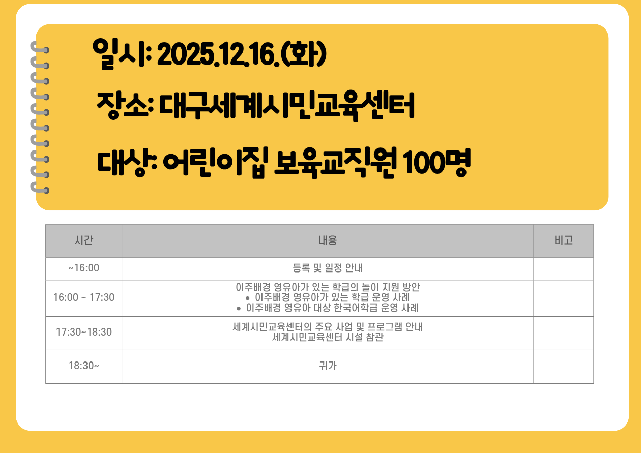 -내용: 이주배경 영유아가 있는 학급의 놀이지원 방안, 세계시민교육센터 프로그램 및 주요 사업 소개 등