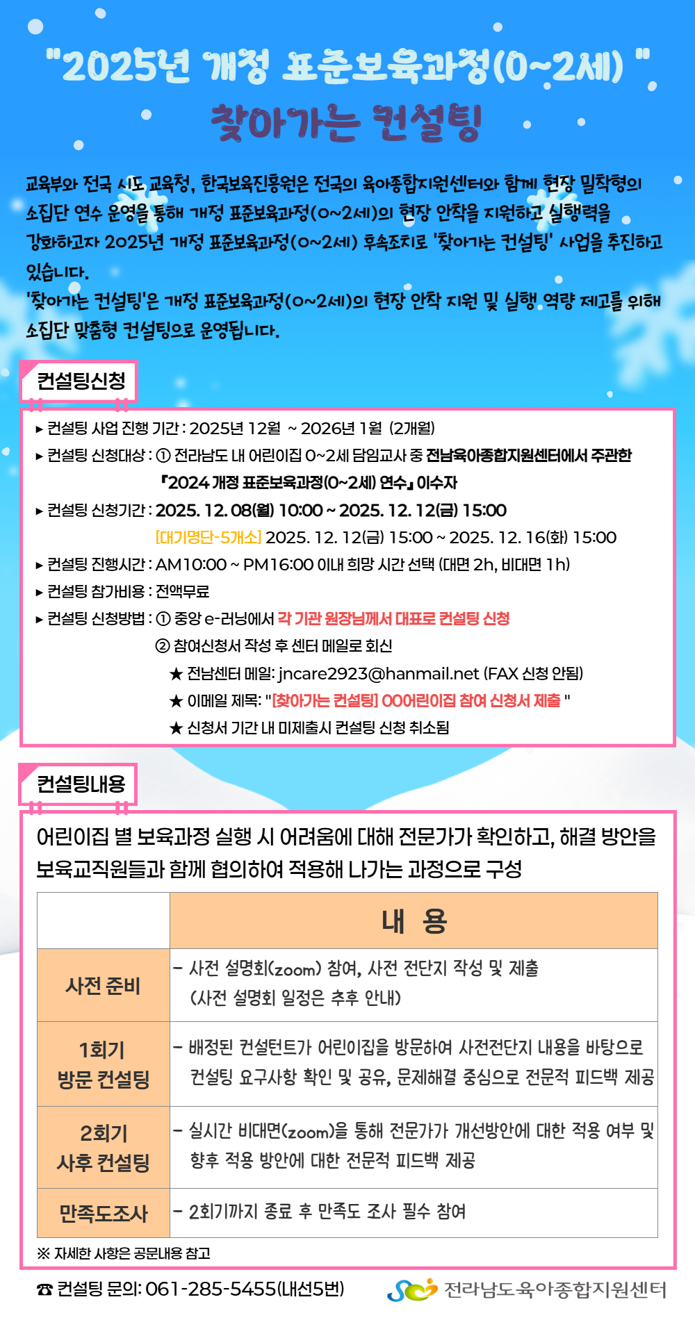 본 컨설팅 신청은 꼭 어린이집 원장님께서 대표로 신청해주시기 바라며 보육 교사가 신청 시 승인되지 않으며 선착순 순번에서 제외됩니다. 이로 인한 불이익은 센터에서 책임지지 않습니다.