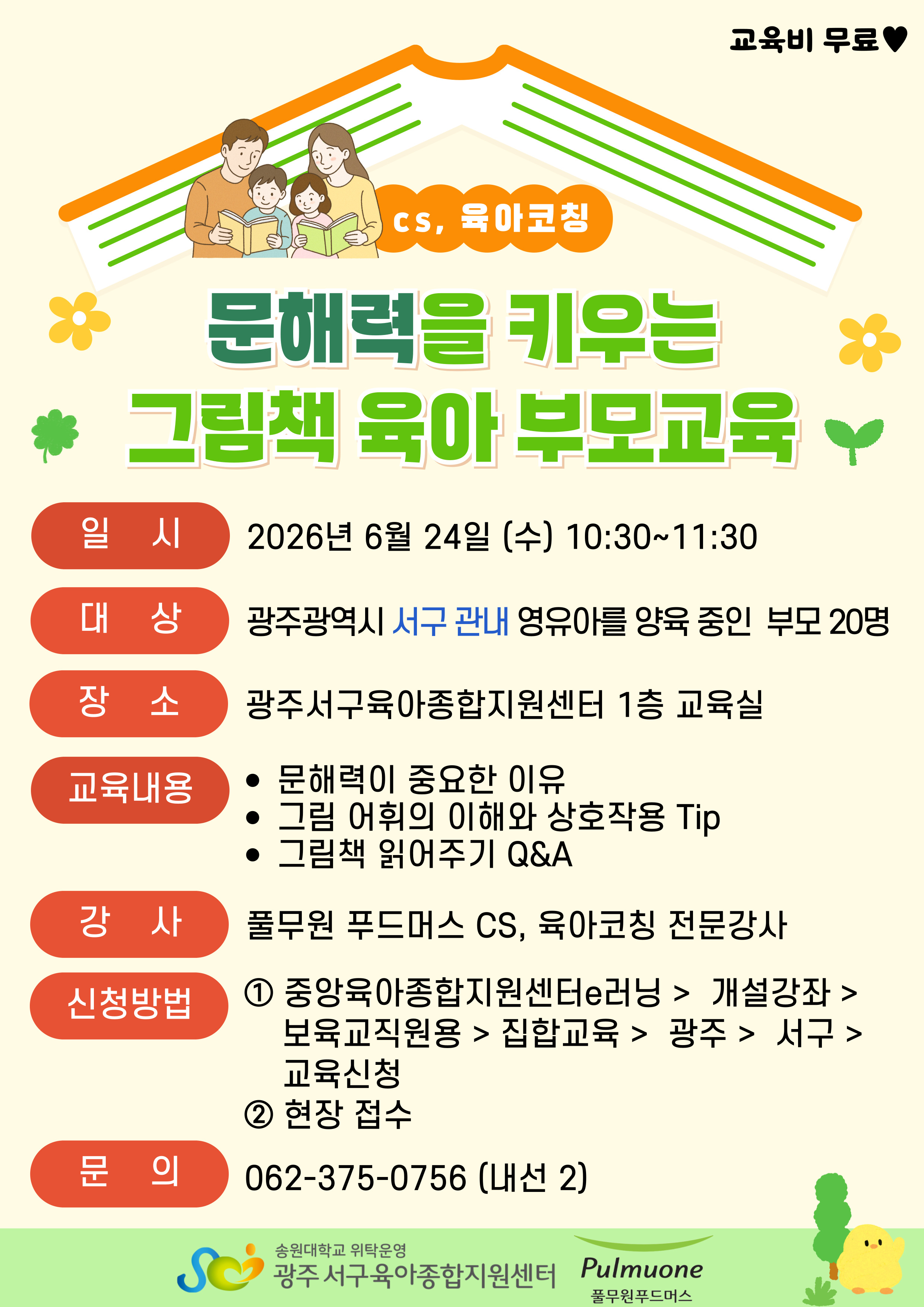 6/24(수) 대면 - [광주 서구] 10:30~11:30 문해력을 키우는 그림책 육아(부모 대상 교육)