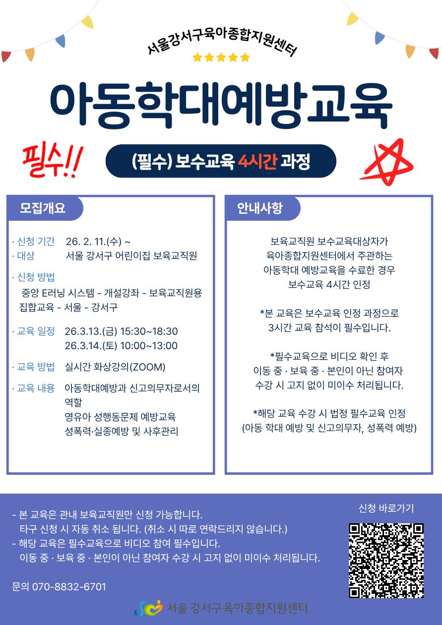 2026년 아동학대예방교육(보수교육 4시간 인정) - 서울 강서구 보육교직원만 가능