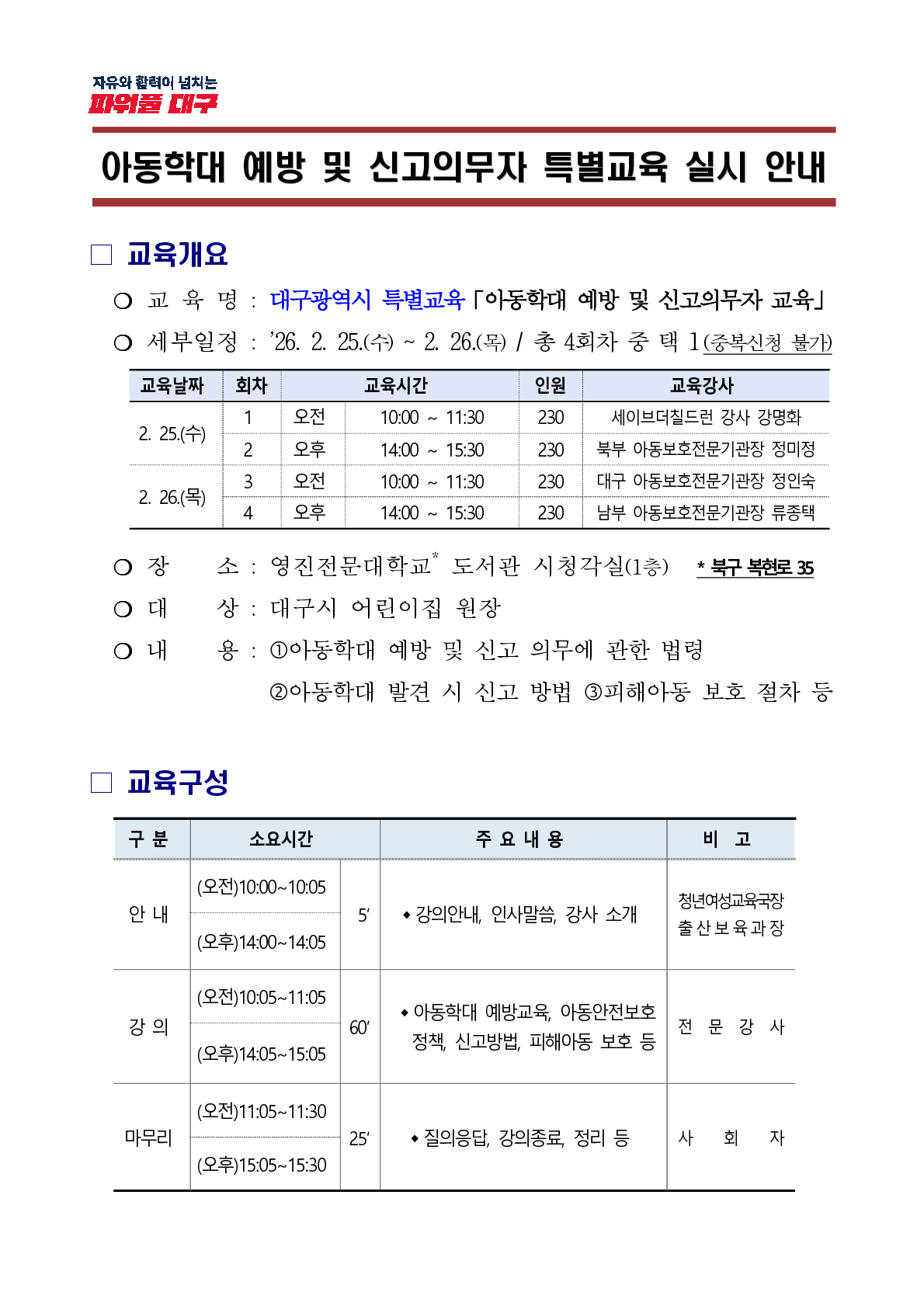 3차(오전) 대구광역시 특별교육 「아동학대 예방 및 신고의무자 교육」